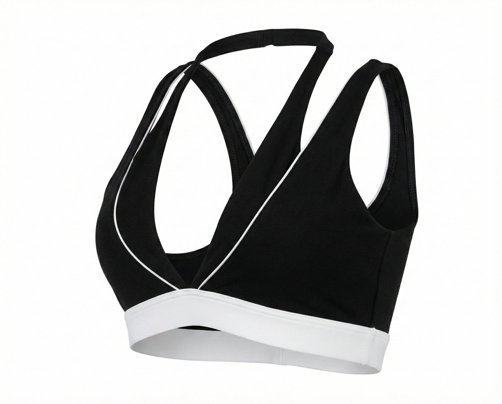 A contouring V-neck halter sports bra with contrast detailing and a supportive double-layer
