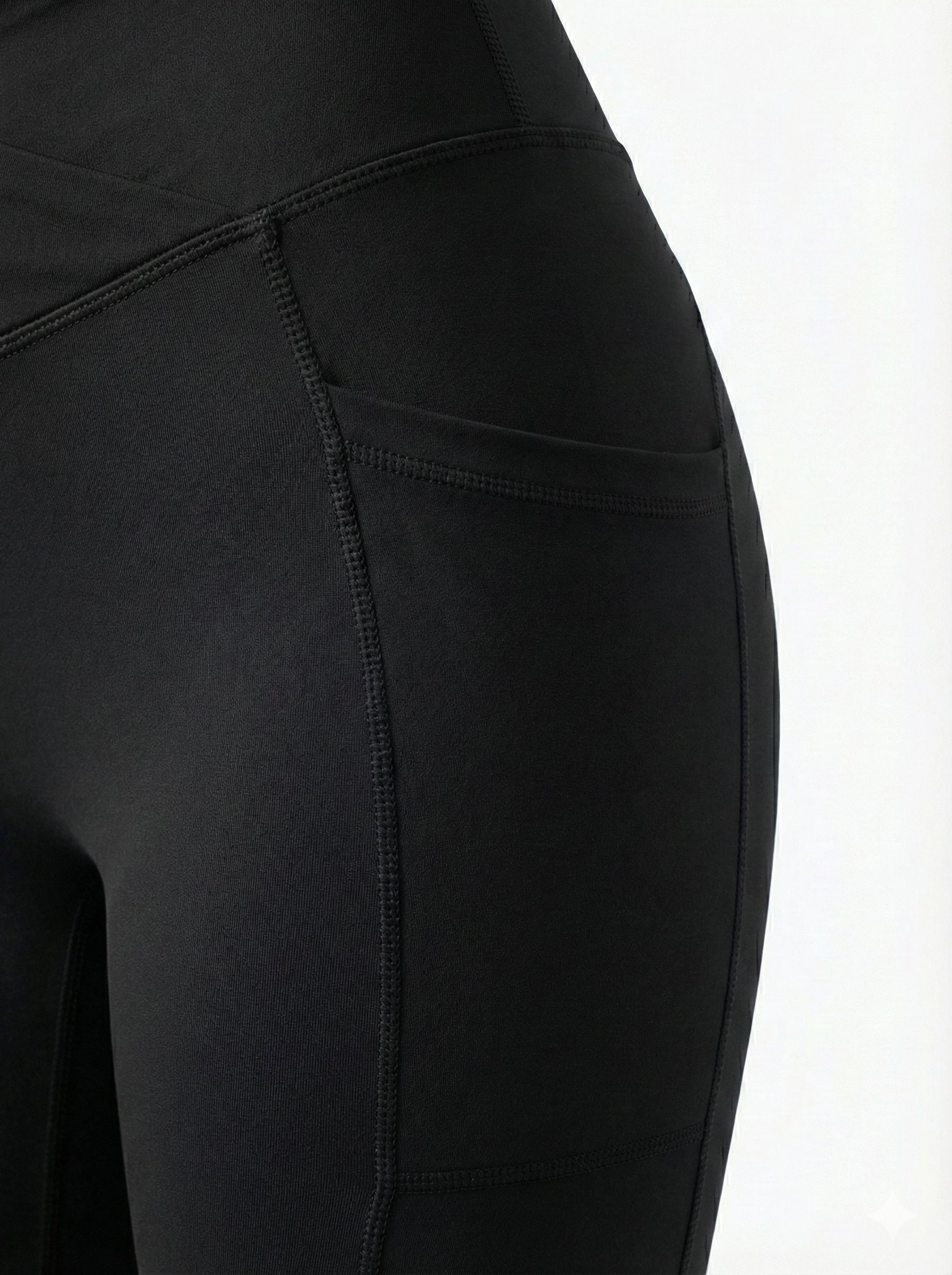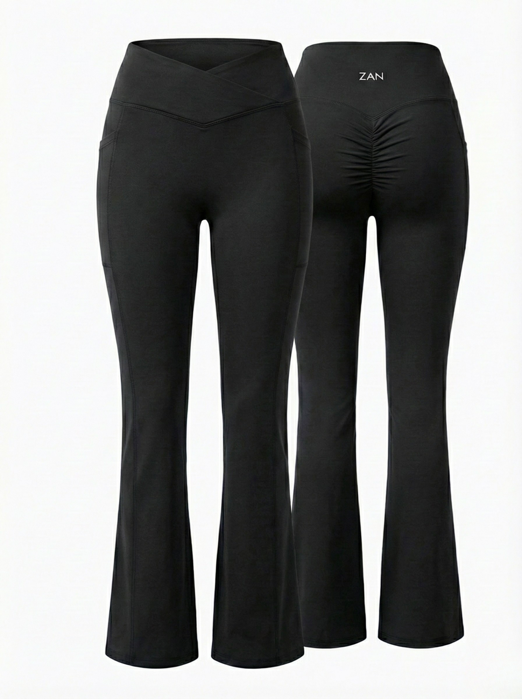 Most flattering flare silhouette in classic black. The crossover waistband cinches the waist, while the hidden scrunch detailing adds shape and lift. Functional pockets make it perfect for studio or street.